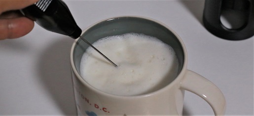次に、温めた豆乳を電動クリーマーで泡立たせます。ここで注意しないといけないのは、かなり回転速度が早くあふれ出ないように気を付けて使ってください。想像以上にふわふわに泡立ちます。