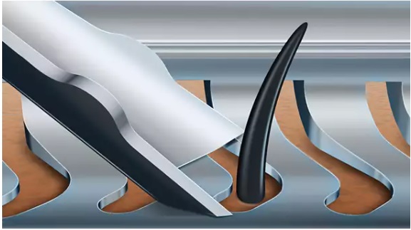「スーパーリフト&カット機構」とは、下のように1枚目の刃が毛を根本から引き上げ、2枚目の刃がリフトアップされた毛をカットする仕組みです。